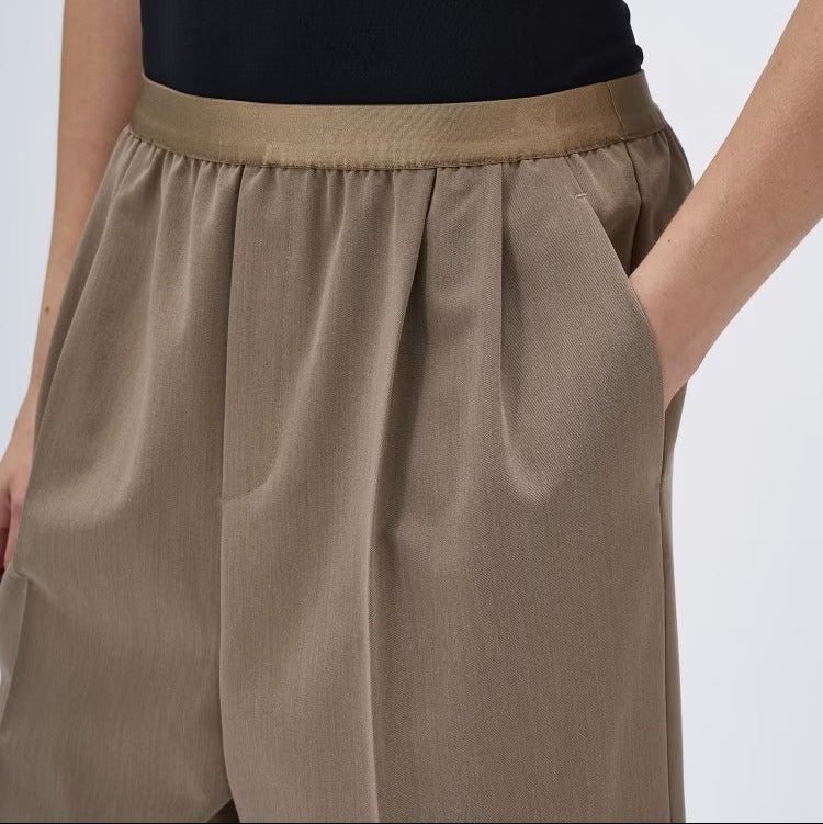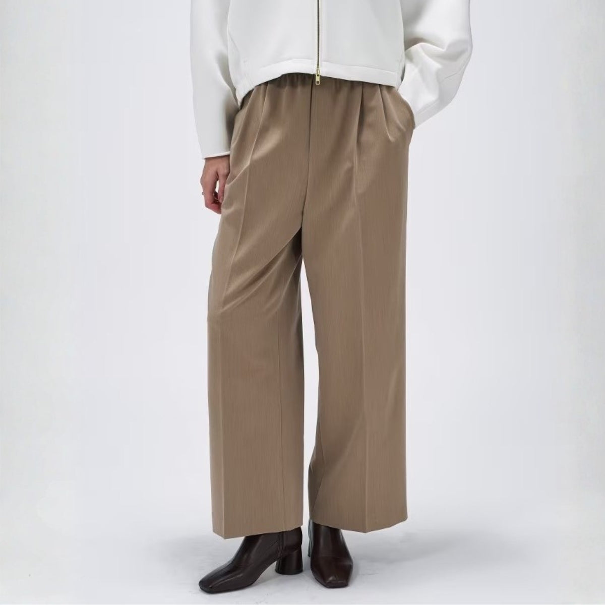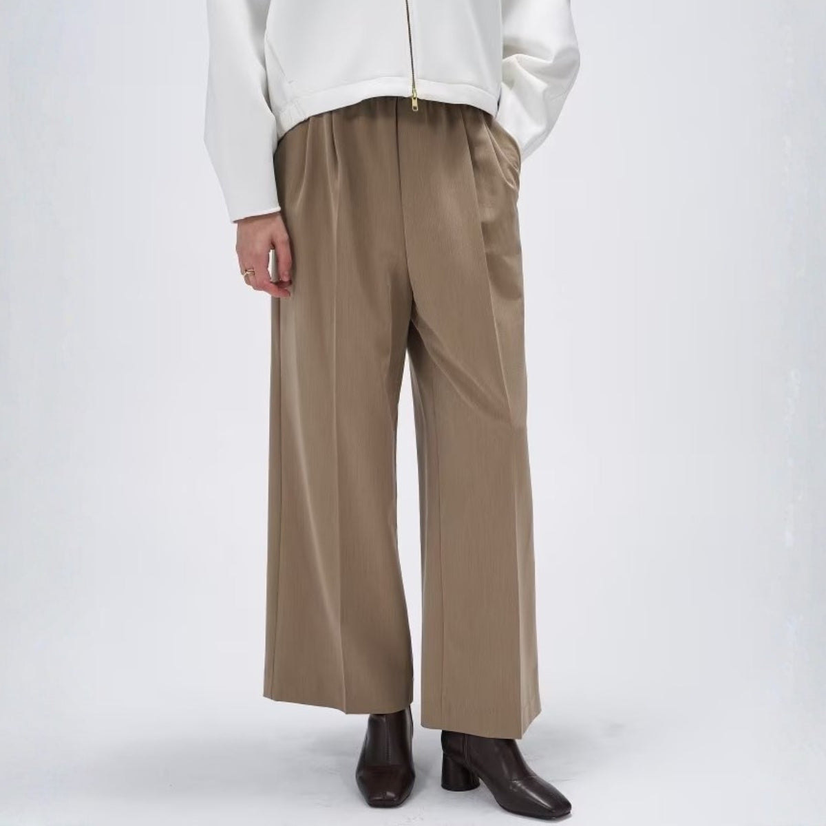打褶設計鬆緊腰帶寬直筒褲 - 灰米|cloenc