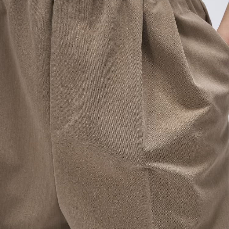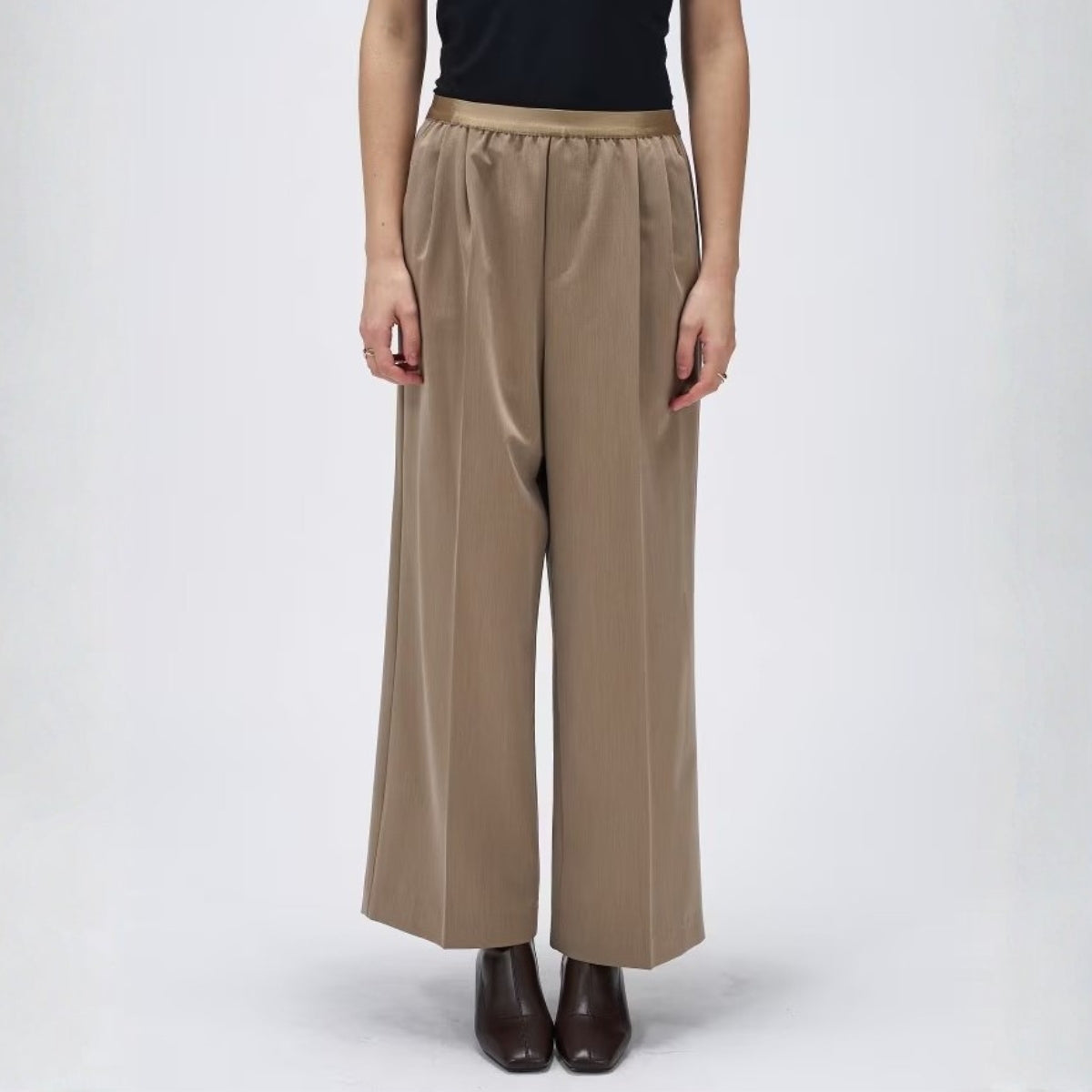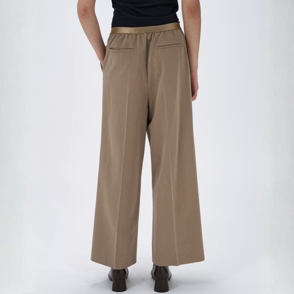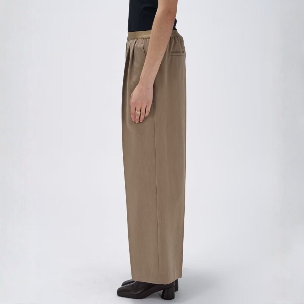 打褶設計鬆緊腰帶寬直筒褲 - 灰米|cloenc