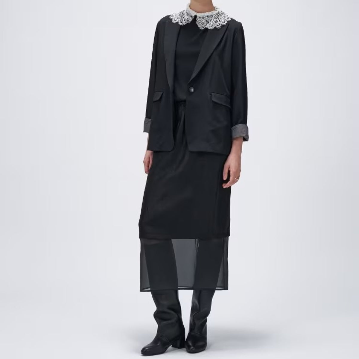 以雙材質疊搭打造層次視覺,後側開衩提升活動度並添加女性化細節。