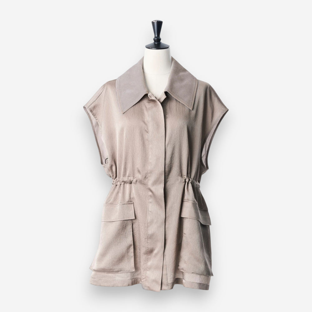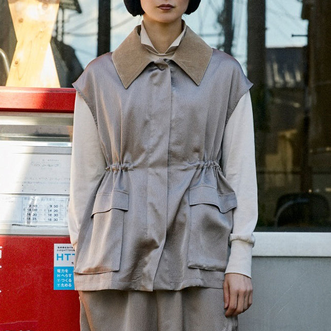 緞面光澤拼接領夾克上衣 - 灰|IKITSUKE