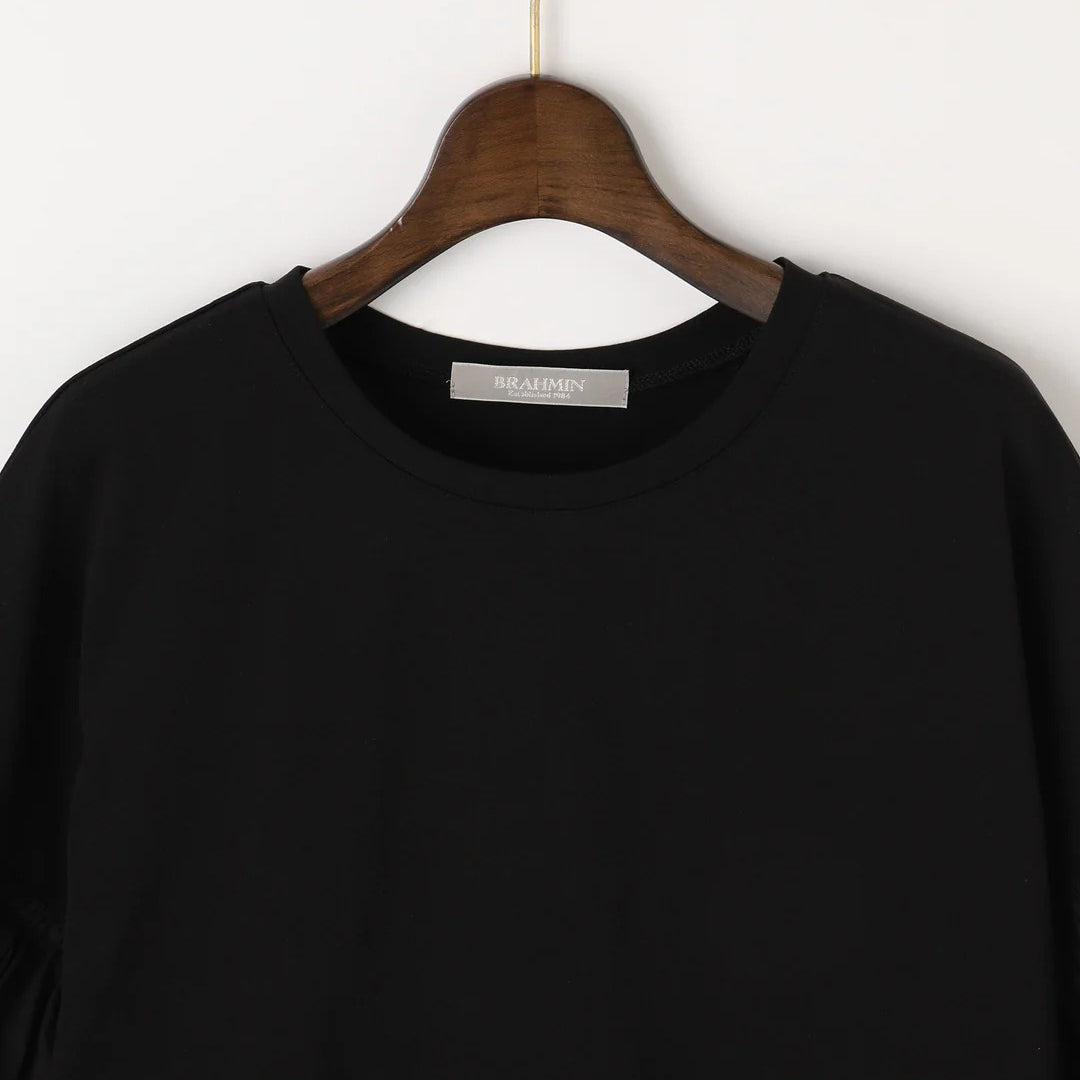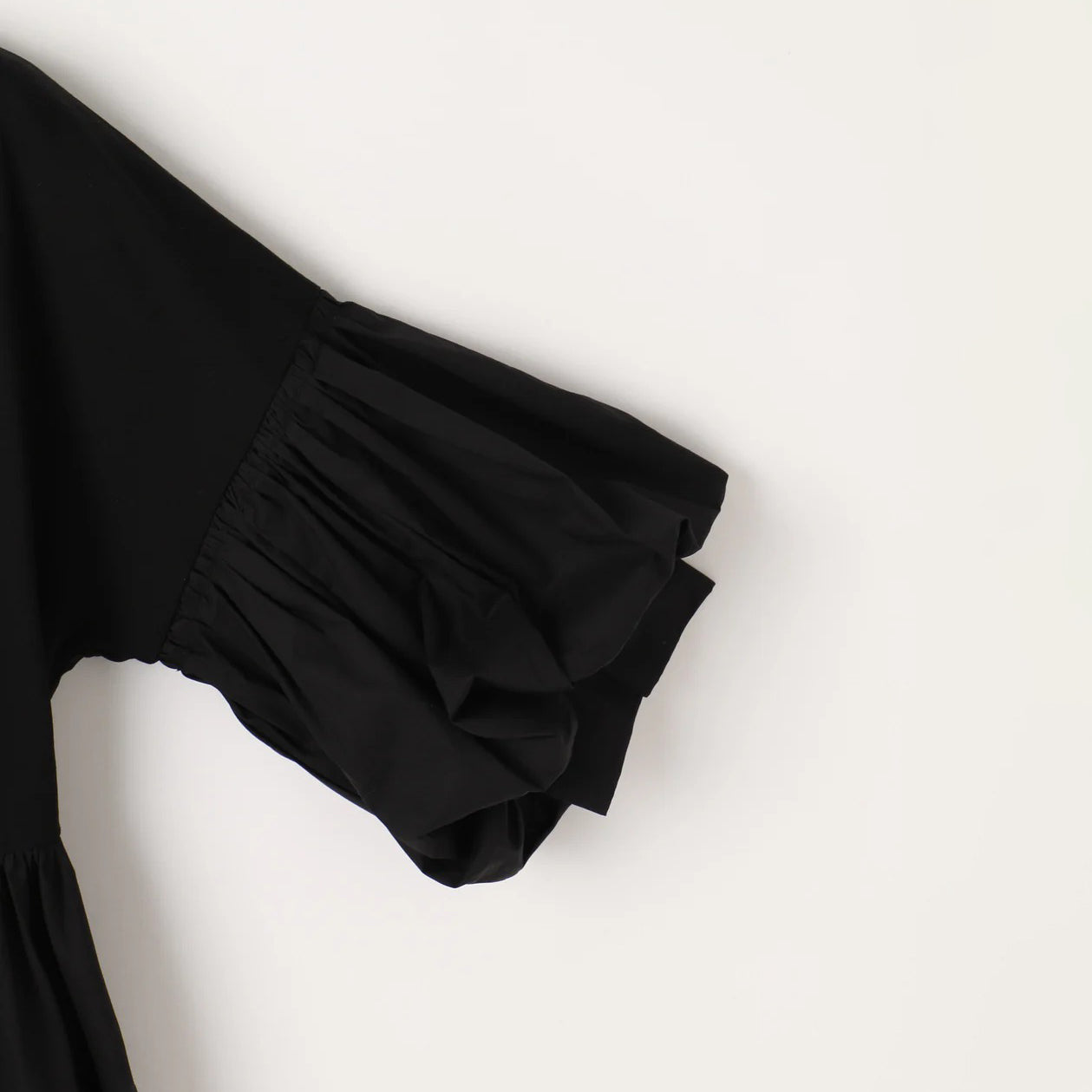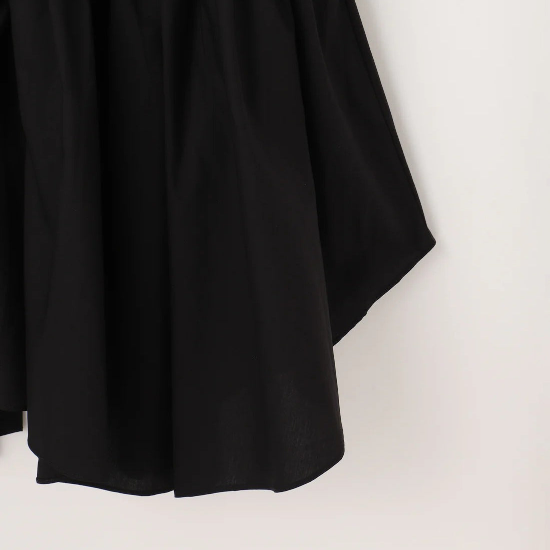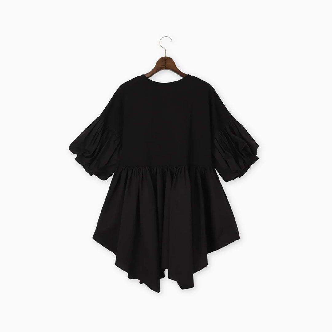 採用輕盈棉質布料並加入細緻抽摺,營造柔和蓬度。下擺以不規則線條呈現自然流動感,使整體視覺輕盈、不顯厚重。
