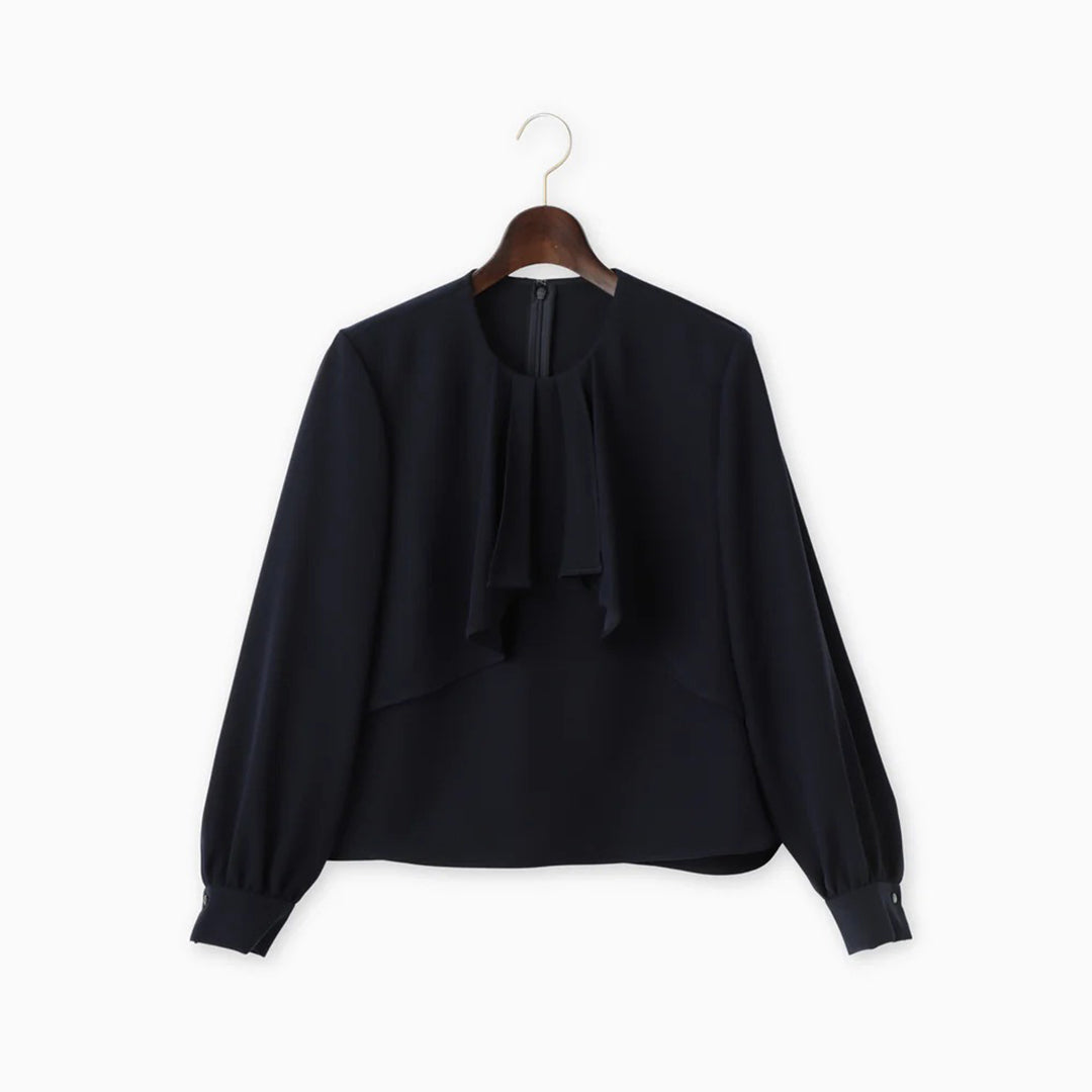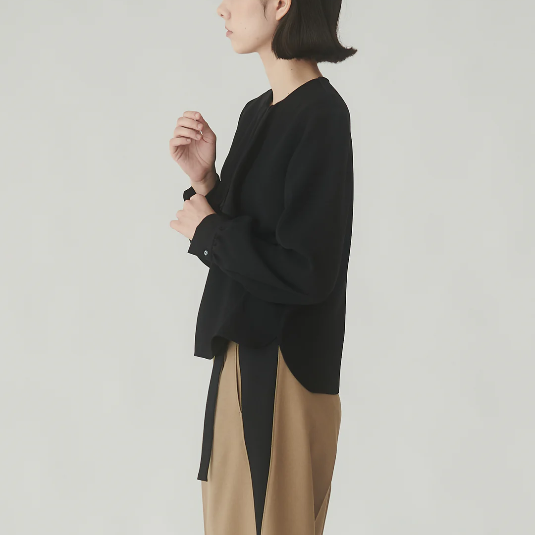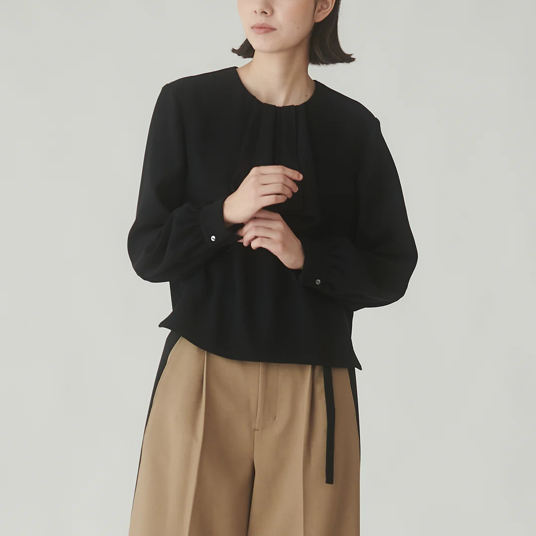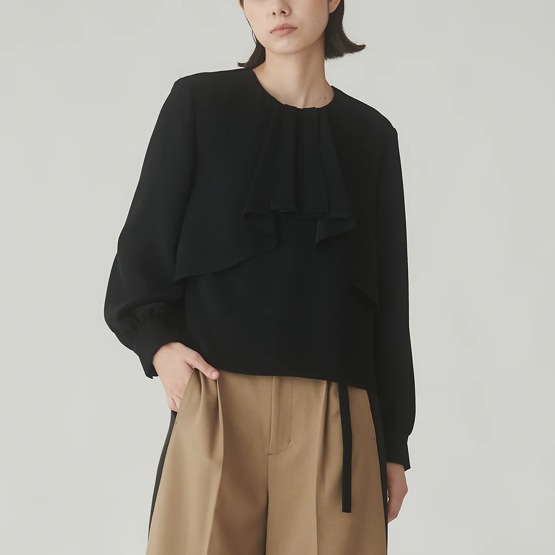 領口與袖口以細緻荷葉邊做點綴,營造帶古典氣息的優雅印象。衣長適中,紮放皆修飾。選用不易皺的雙面織布,手感滑順、微蓬而不厚重,四季皆能自在著用。