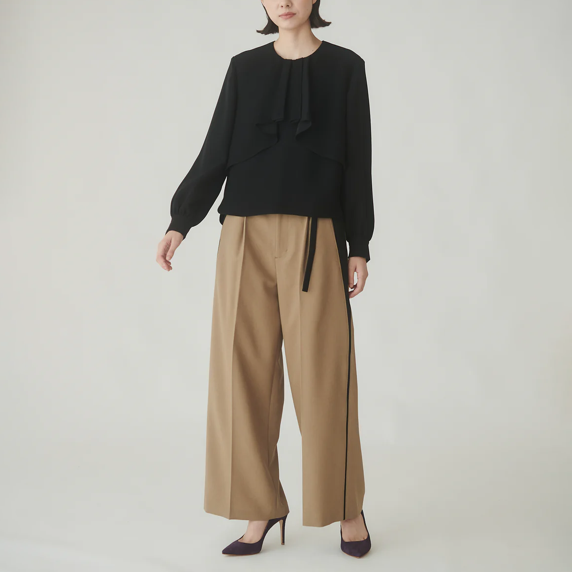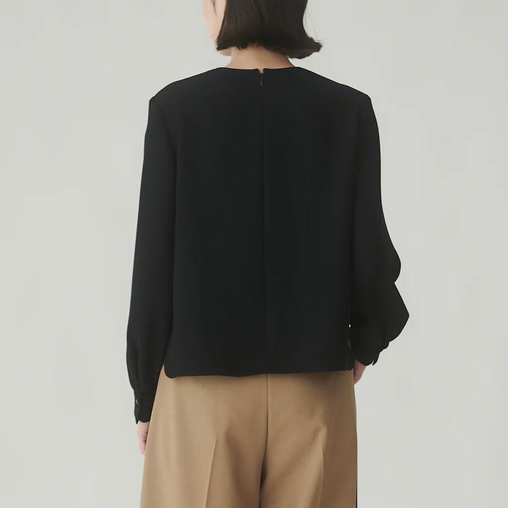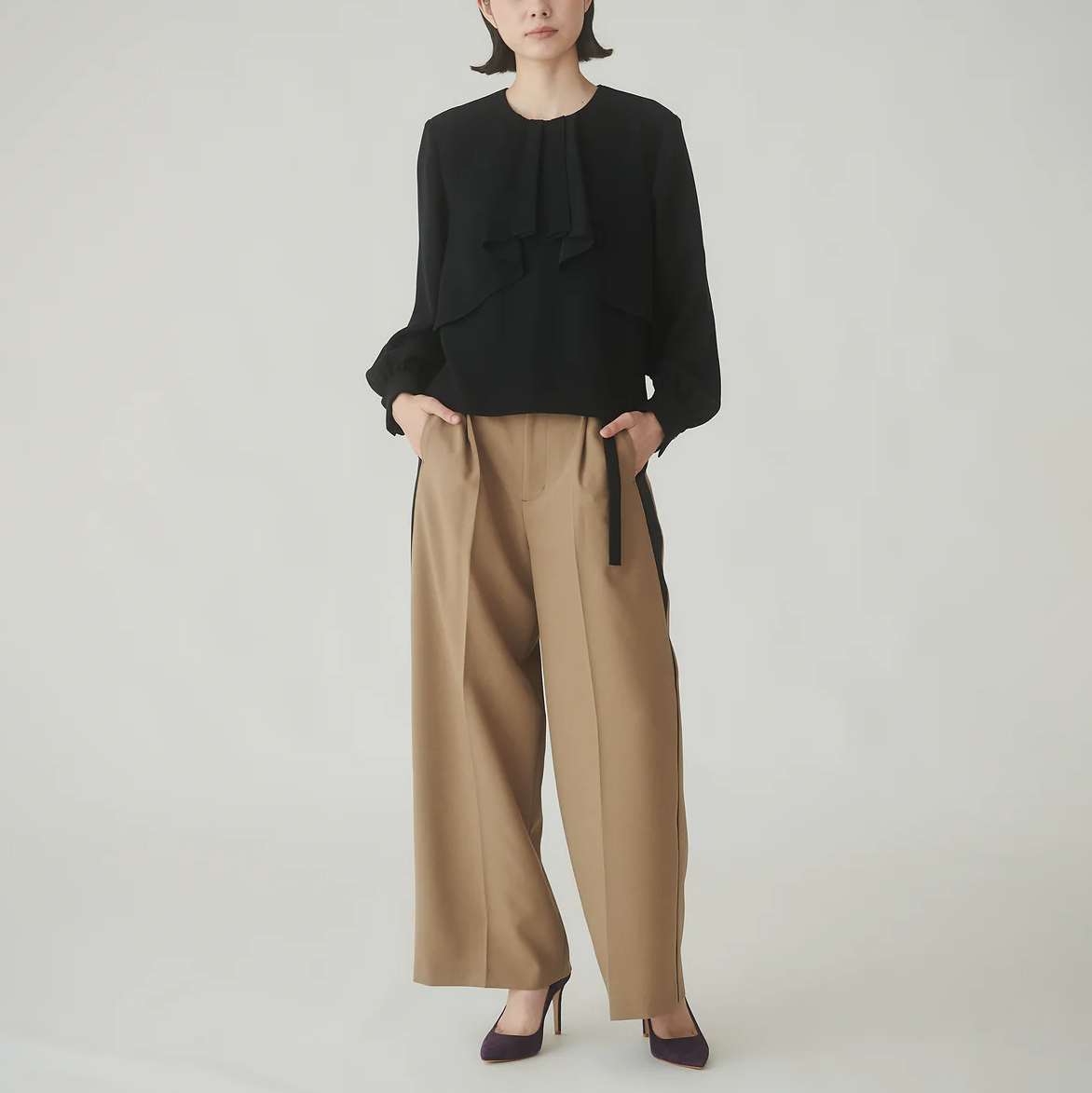 領口與袖口以細緻荷葉邊做點綴,營造帶古典氣息的優雅印象。衣長適中,紮放皆修飾。選用不易皺的雙面織布,手感滑順、微蓬而不厚重,四季皆能自在著用。