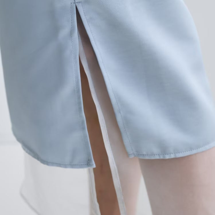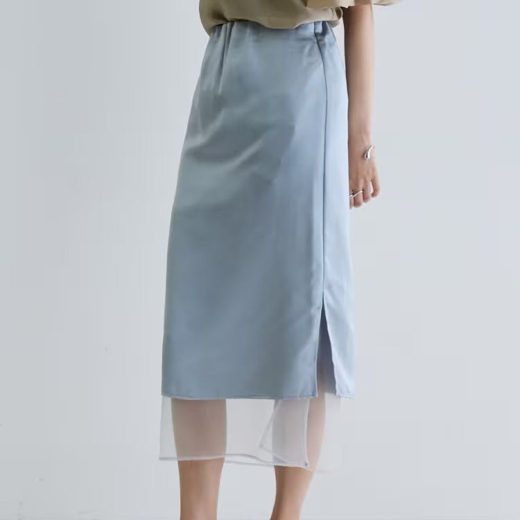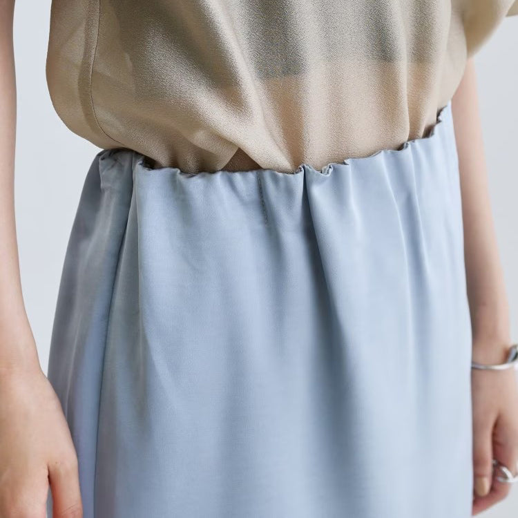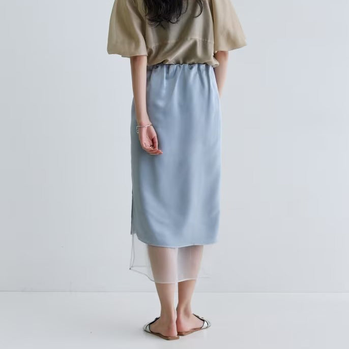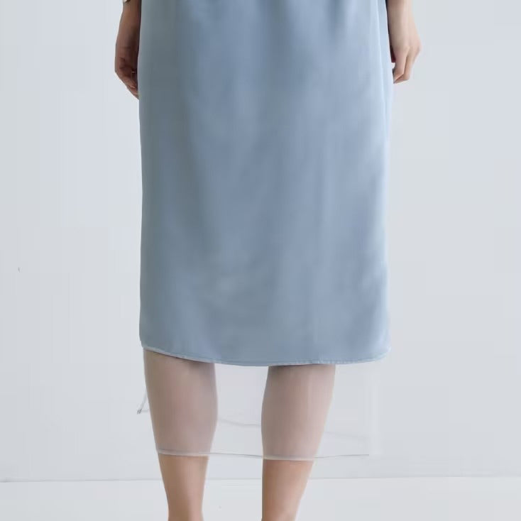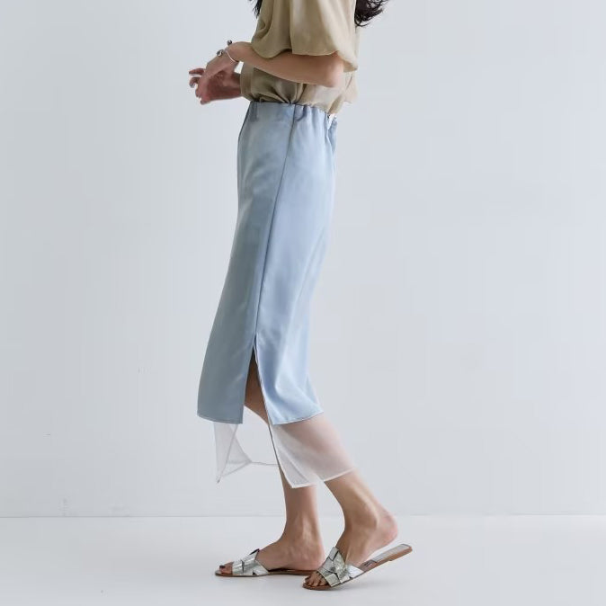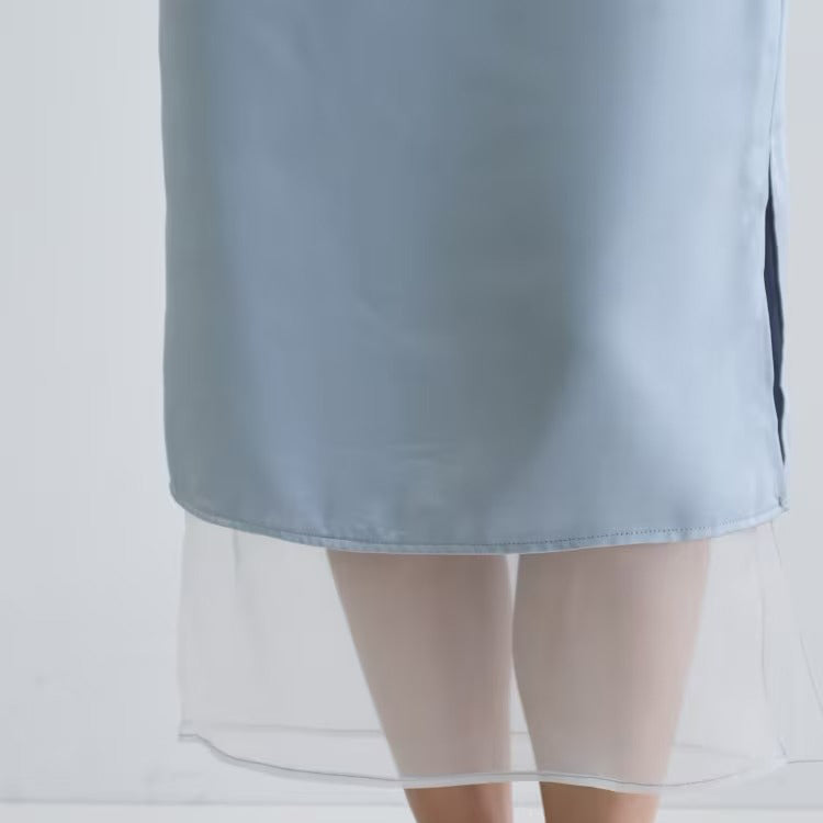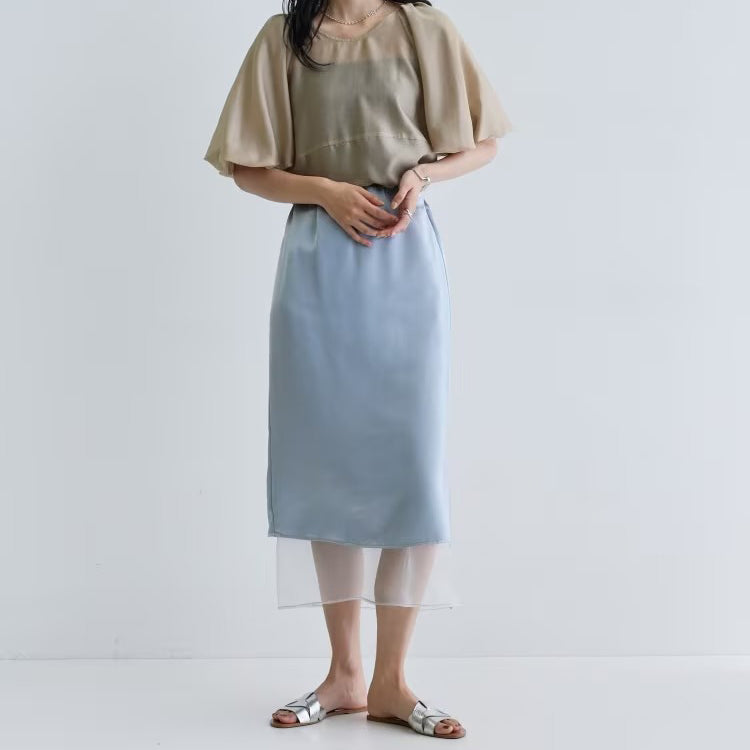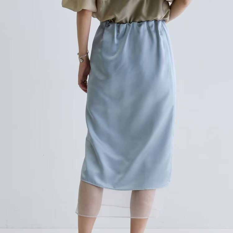 以光澤感的緞面為基底,外層疊加輕盈的歐根紗,打造出富有透明感的層次設計。裙擺隨步伐輕柔搖曳,兼具優雅與俐落氛圍。無論搭配修身上衣展現比例感,或與寬鬆針織、襯衫組合,皆能呈現不同風格。