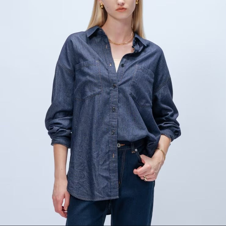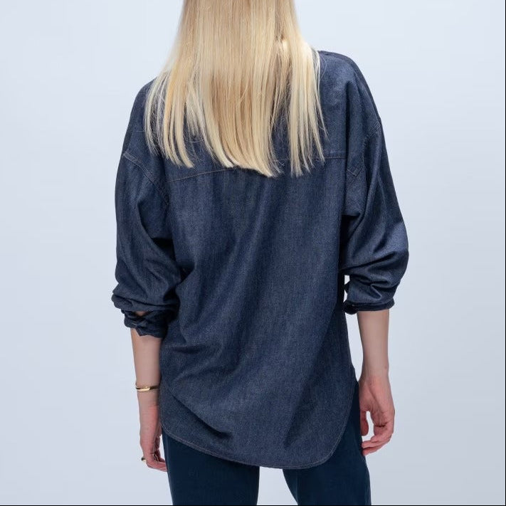 輕薄柔軟的丹寧布,版型寬鬆、衣長覆蓋臀部,穿起來率性又安心。