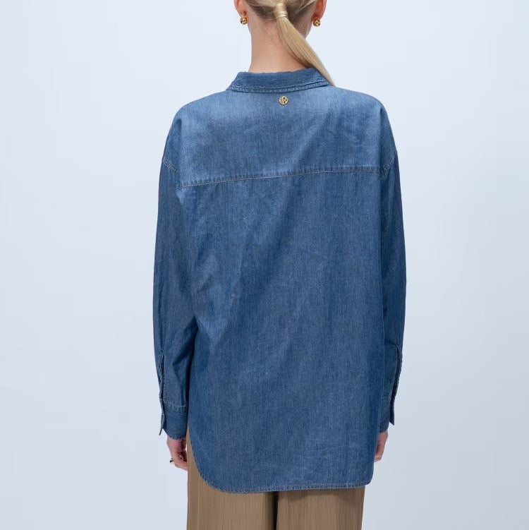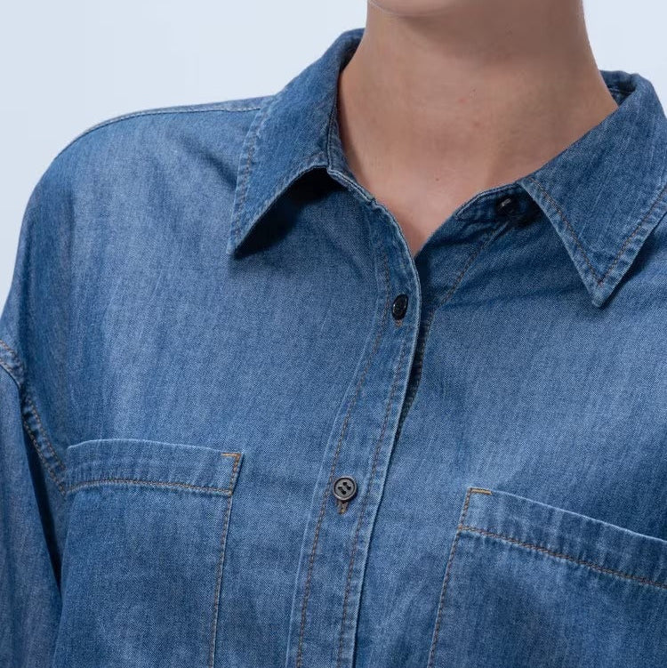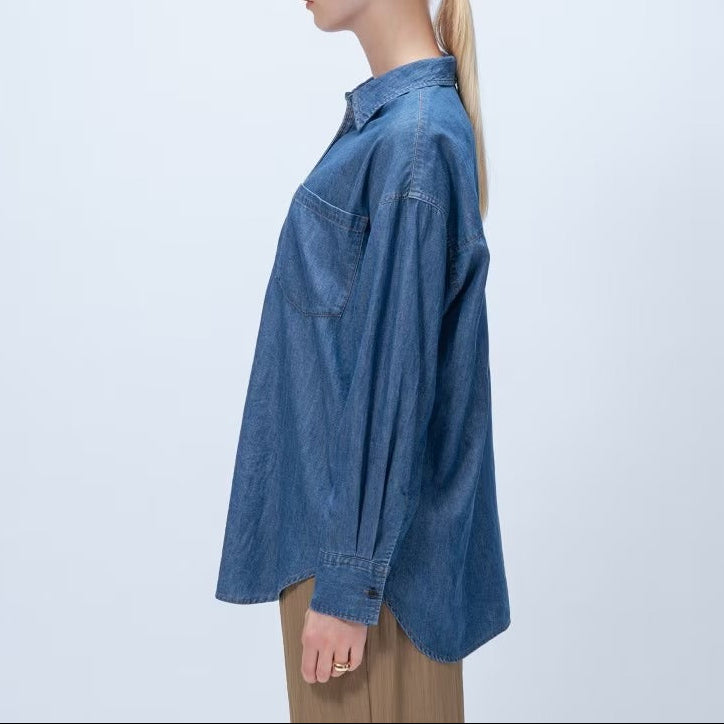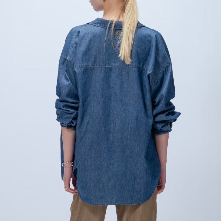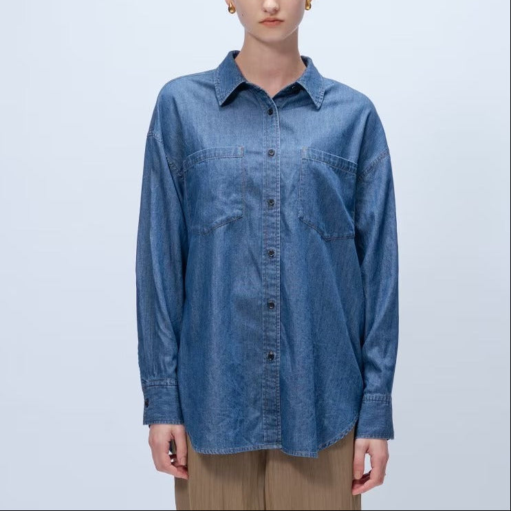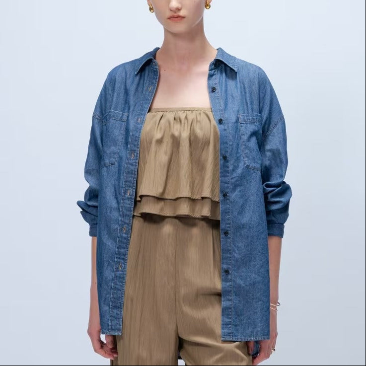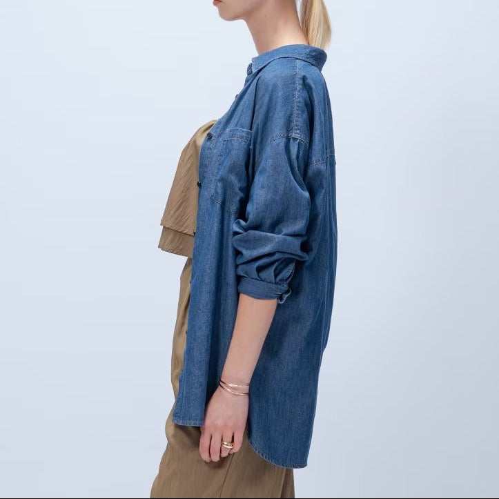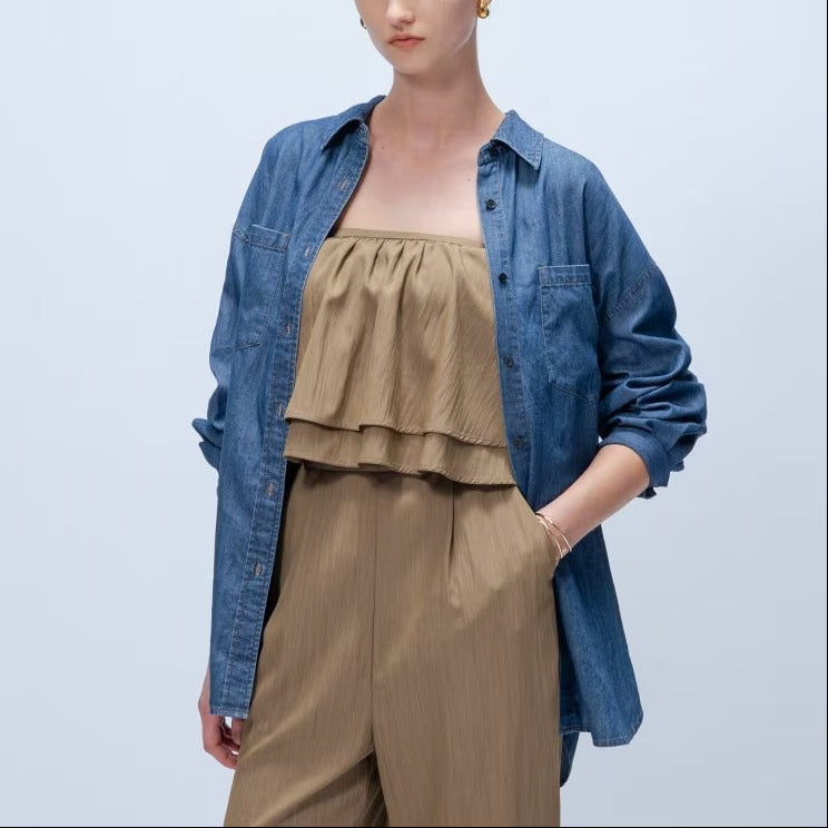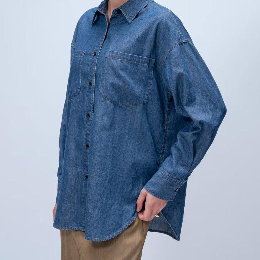 輕薄柔軟的丹寧布,版型寬鬆、衣長覆蓋臀部,穿起來率性又安心。