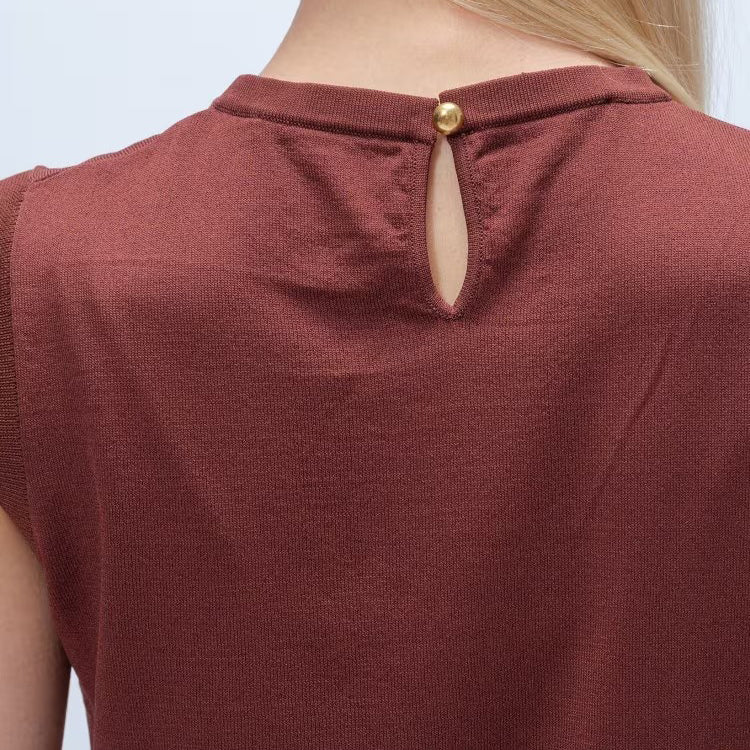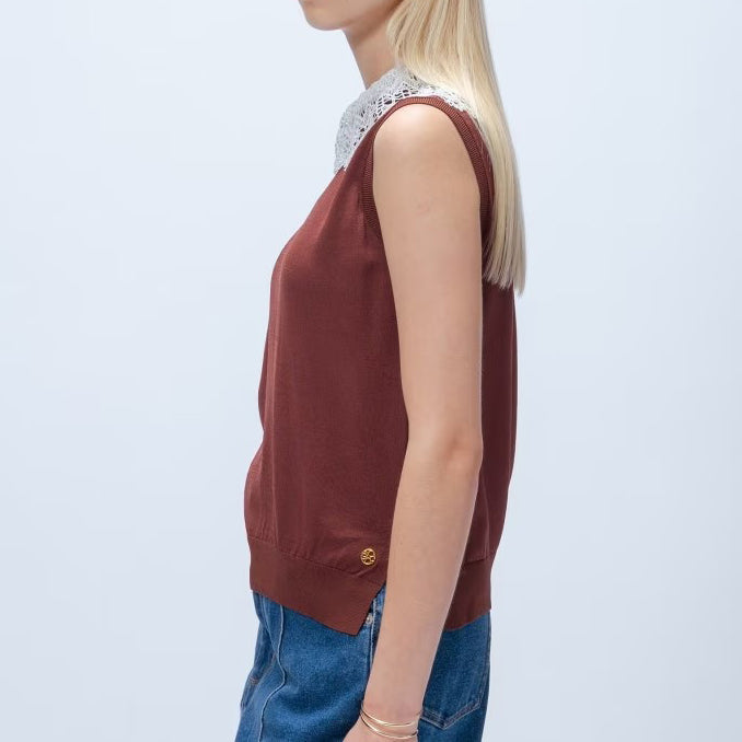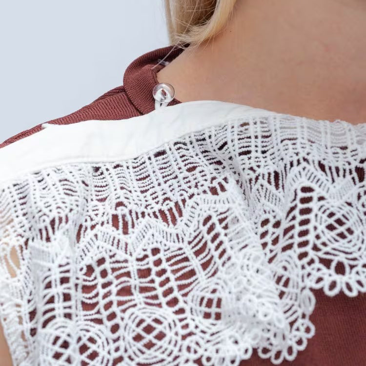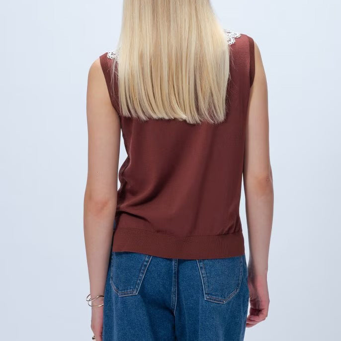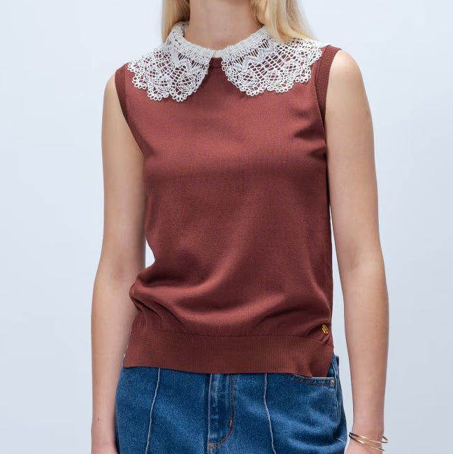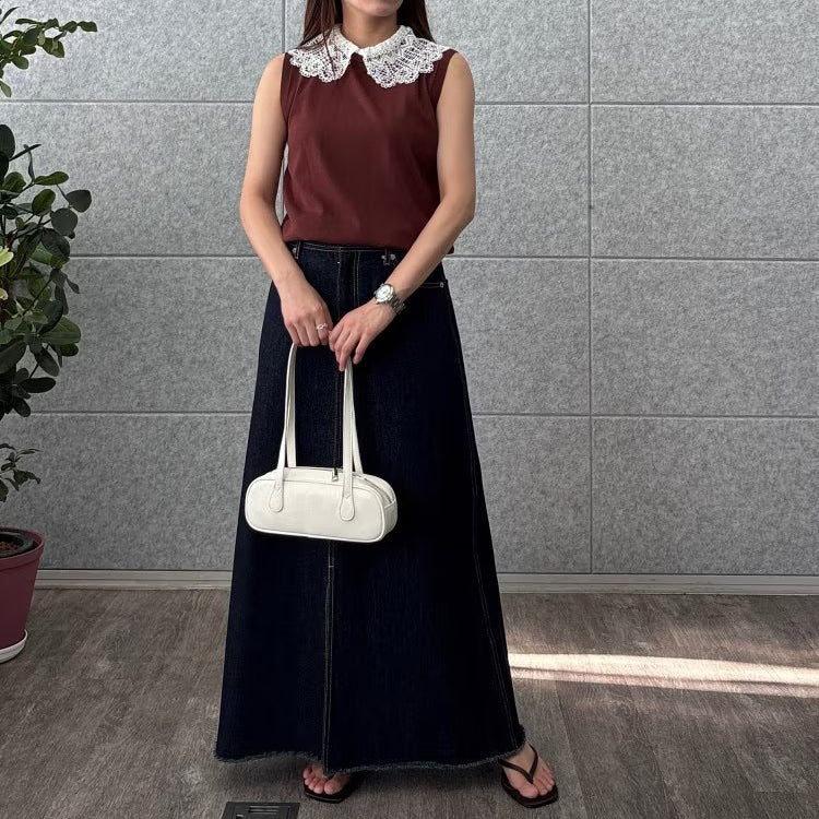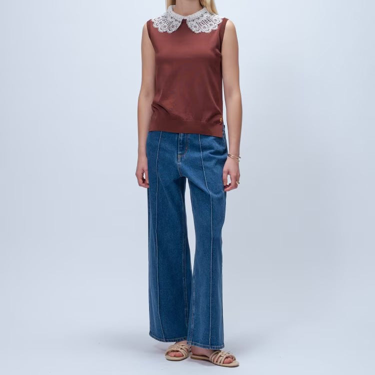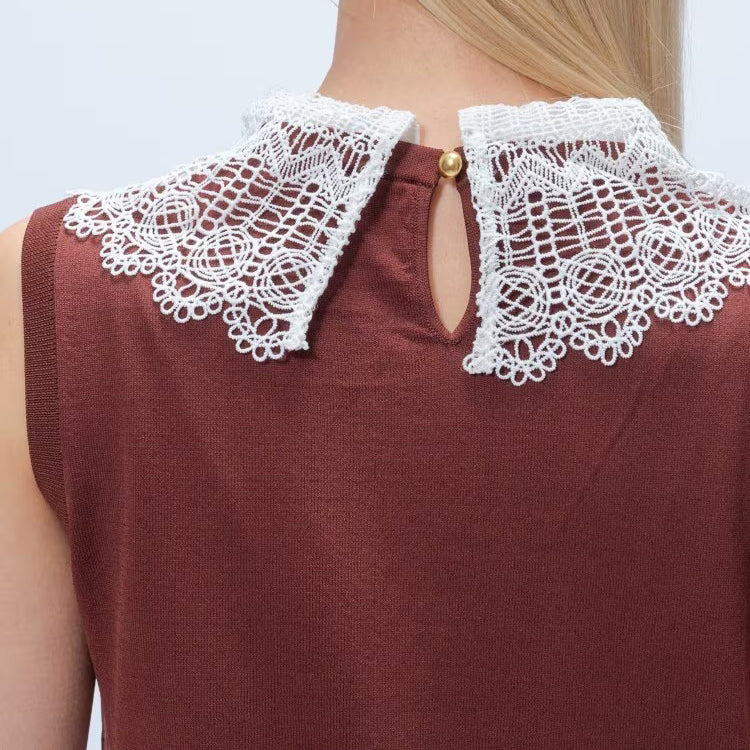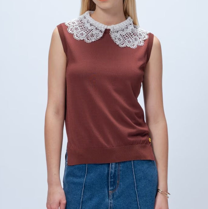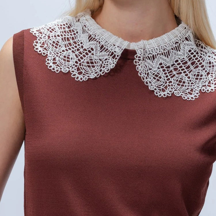 以細緻蕾絲領點綴的無袖上衣,領片可拆卸,能在簡約與華麗之間自由切換。面料柔軟平滑,觸感親膚透氣,夏季單穿或作為西外、針織外套內搭都能展現俐落優雅氣質。拆下蕾絲領後,搭配休閒褲或牛仔褲,呈現清爽日常風格。