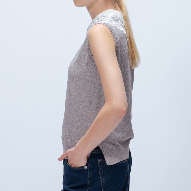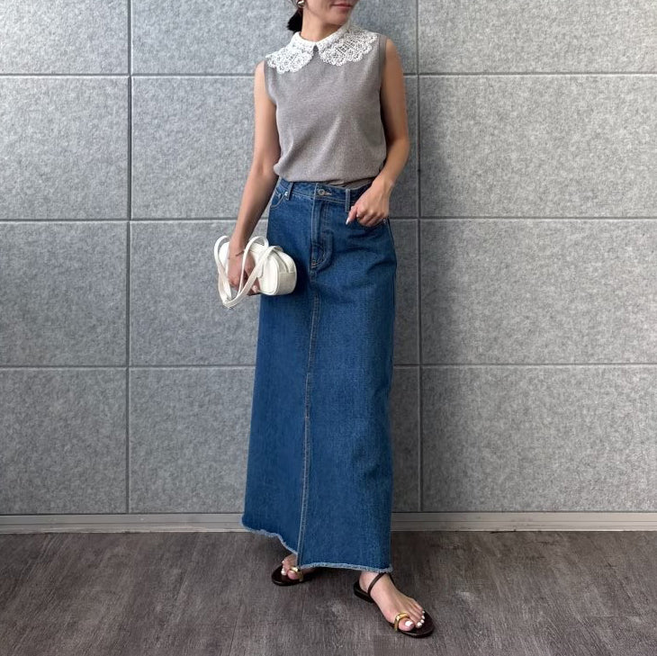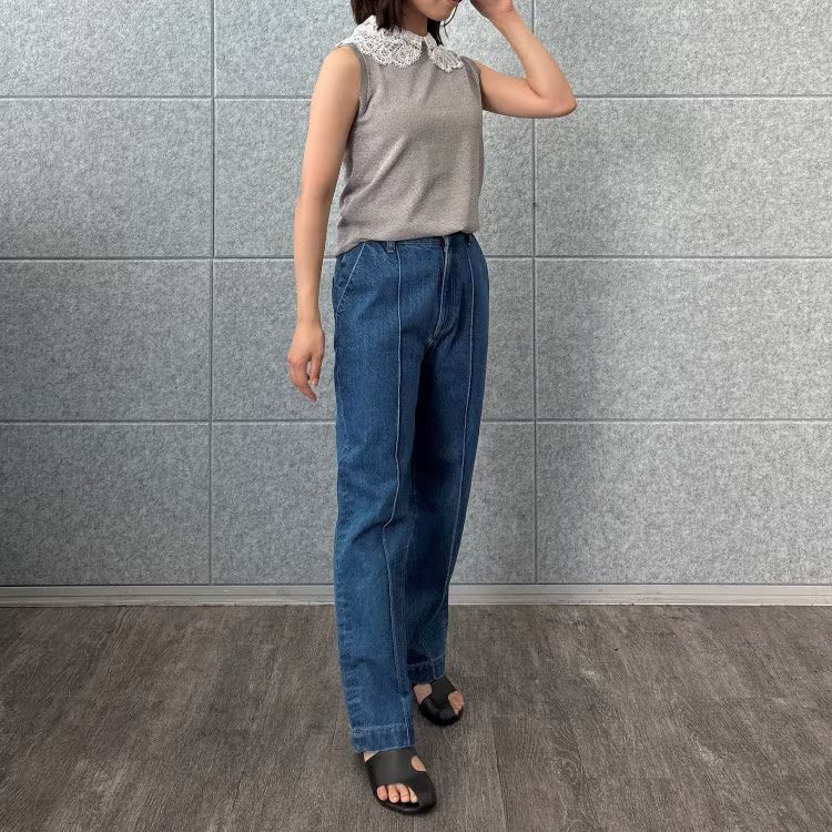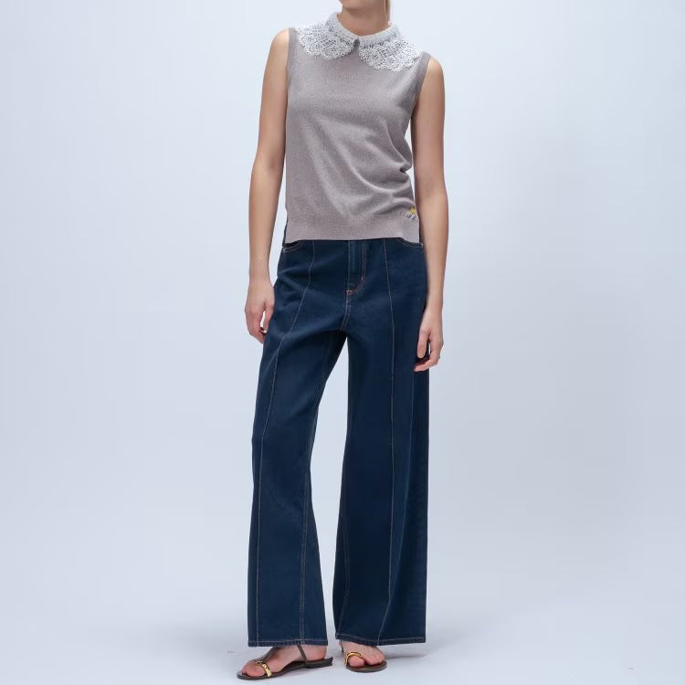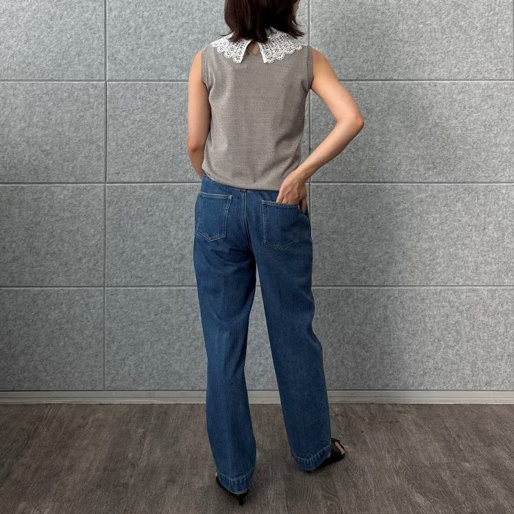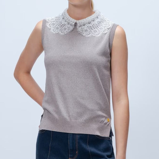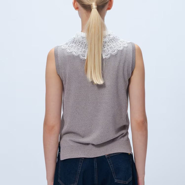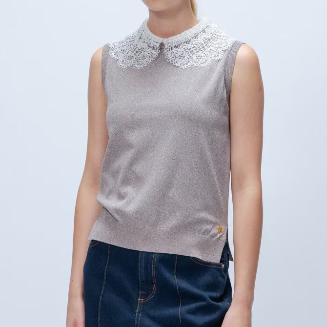 以細緻蕾絲領點綴的無袖上衣,領片可拆卸,能在簡約與華麗之間自由切換。面料柔軟平滑,觸感親膚透氣,夏季單穿或作為西外、針織外套內搭都能展現俐落優雅氣質。拆下蕾絲領後,搭配休閒褲或牛仔褲,呈現清爽日常風格。