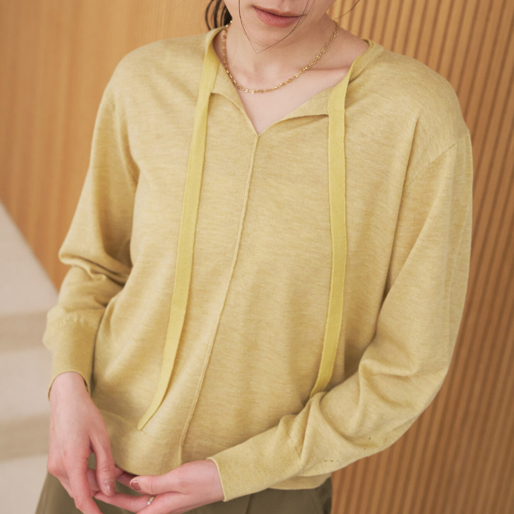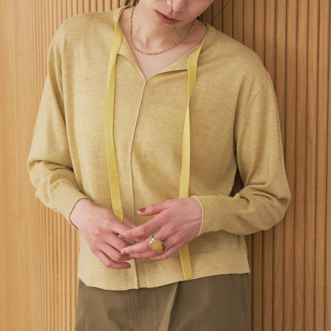 領口繩裝飾開領針織上衣 - 芥黃|Audrey and John Wad