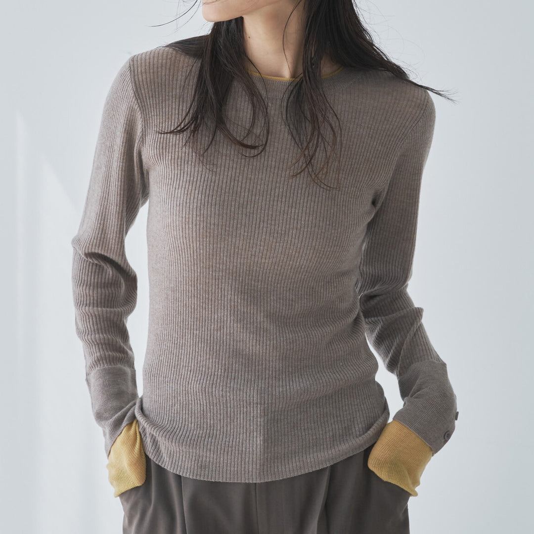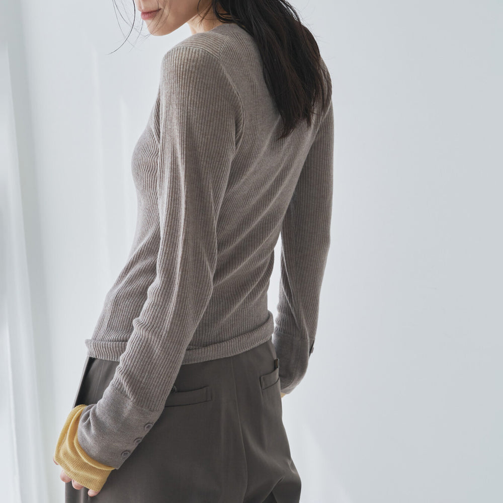 袖口拼色紐扣裝飾針織上衣 - 深米x芥黃|Audrey and John Wad