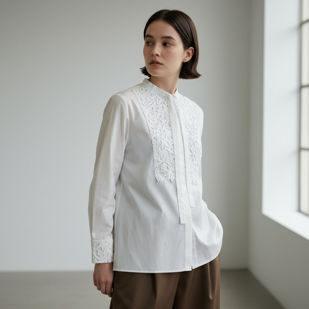 蕾絲拼接設計七分袖襯衫 - 黑|ANANA