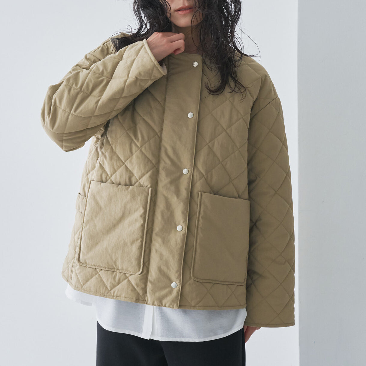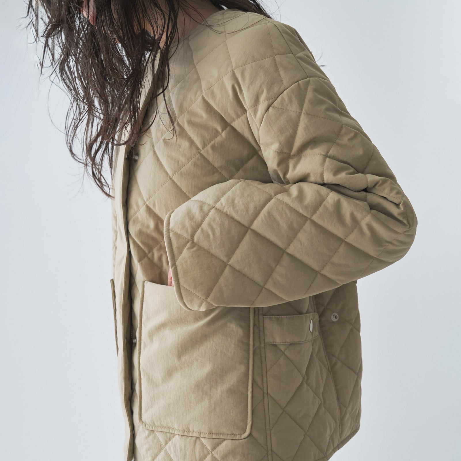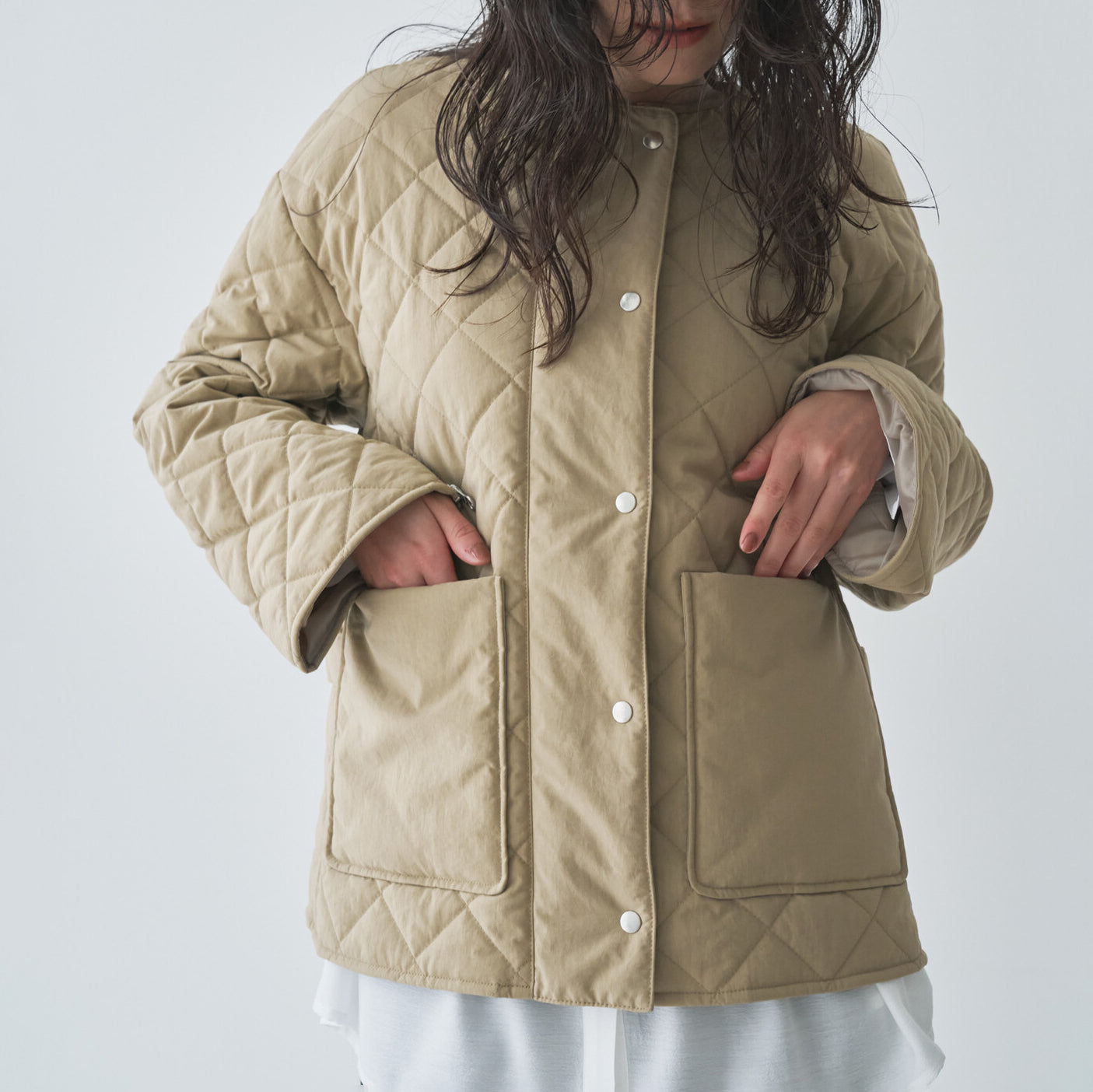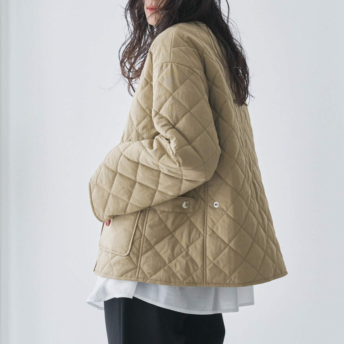 帶有成熟氛圍的鋪棉外套,捨去多餘裝飾,以俐落無領設計呈現清爽輪廓,輕盈好穿不顯厚重。