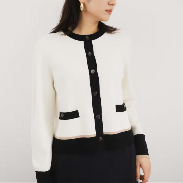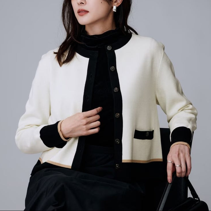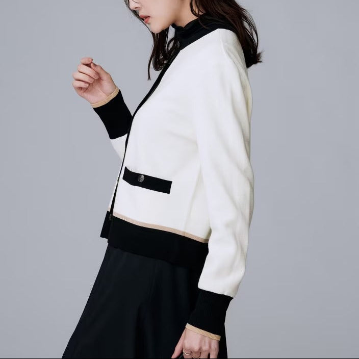 三色滾邊點綴的圓領開襟衫,採米蘭羅紋織法與方形口袋設計。