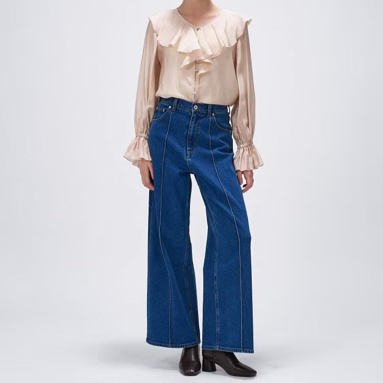 以俐落V領串起層層荷葉邊,垂墜柔和不過於浮誇,襯出優雅輪廓。