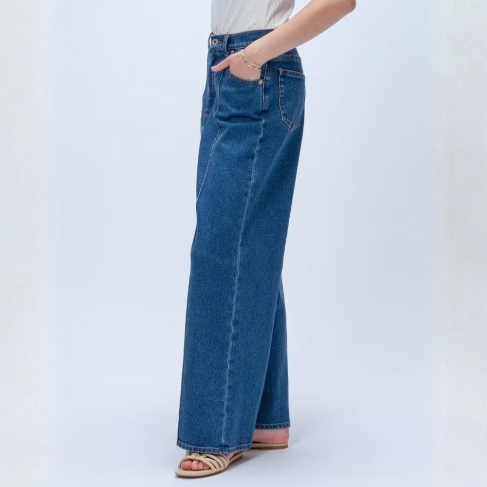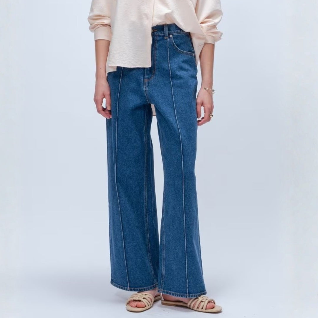 中線設計彈性丹寧寬褲 - 淺藍|cloenc
